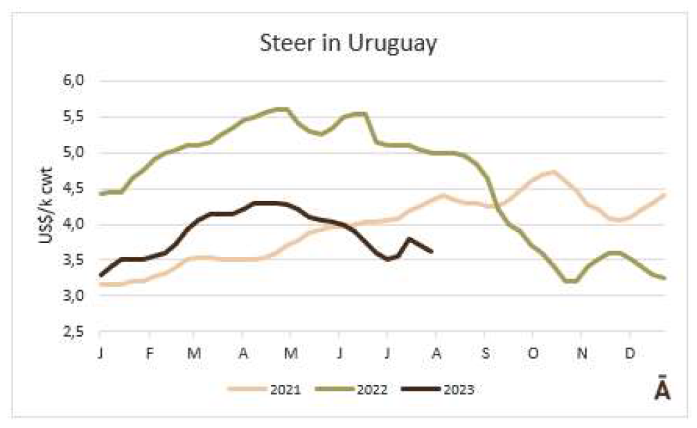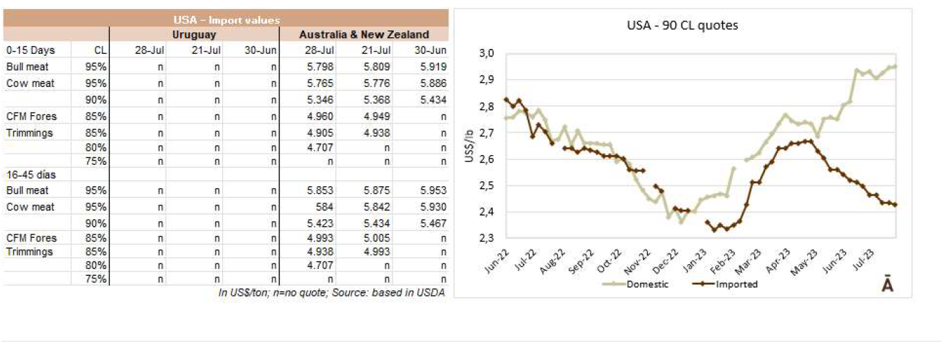 一位貿(mào)易商表示,在大洋洲(新西蘭和澳大利亞)大量牛肉供應(yīng)占主導(dǎo)地位的情況下,美國(guó)進(jìn)口市場(chǎng)并沒(méi)有表現(xiàn)出很大的變化。烏拉圭配額內(nèi)牛前部位肉90CL的參考價(jià)格為FOB 4550美元每噸。