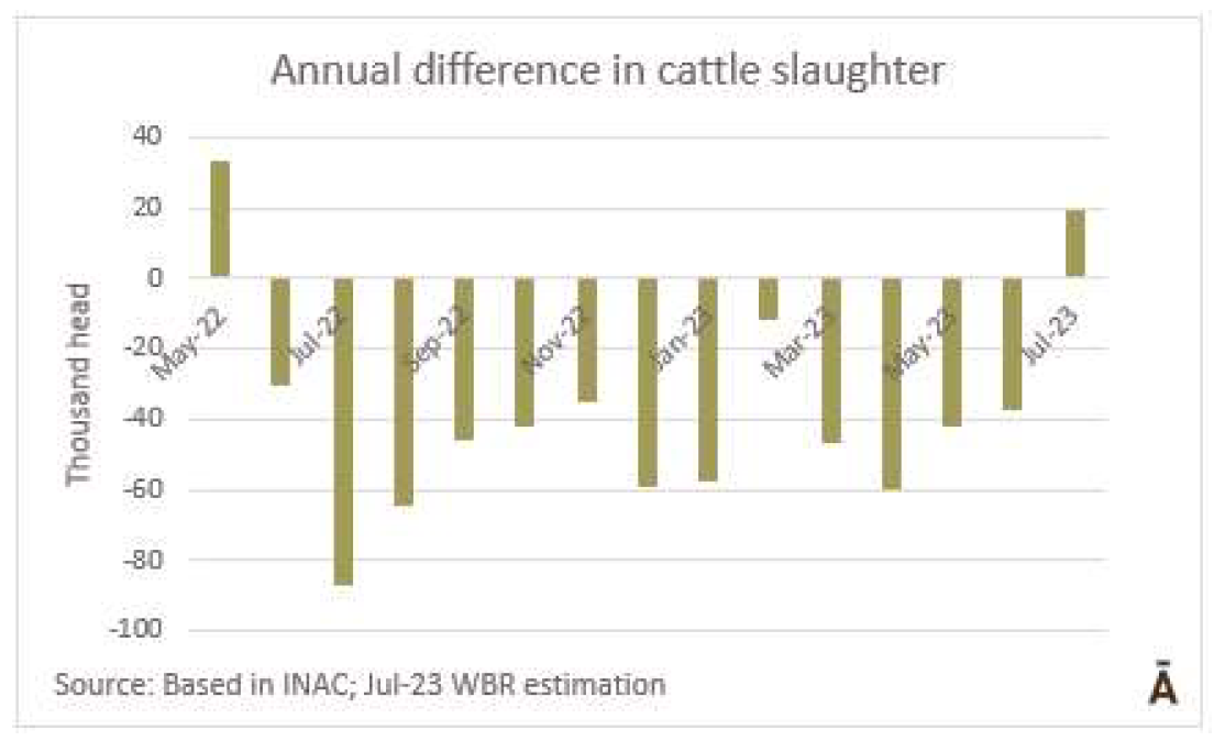 根據(jù)SENASA臨時(shí)數(shù)據(jù),7月份的屠宰許可包括129萬(wàn)頭牛,比前一個(gè)月減少了1%,但是比一年前增加了14%。年度增幅最大的品種是小母牛(26%),其次是奶牛(19%)和幼牛(16%),對(duì)公牛的屠宰沒(méi)有改變。與5月和6月的比例一致,7月母牛屠宰比例為48.7%,比去年同月增加了三個(gè)百分點(diǎn)。