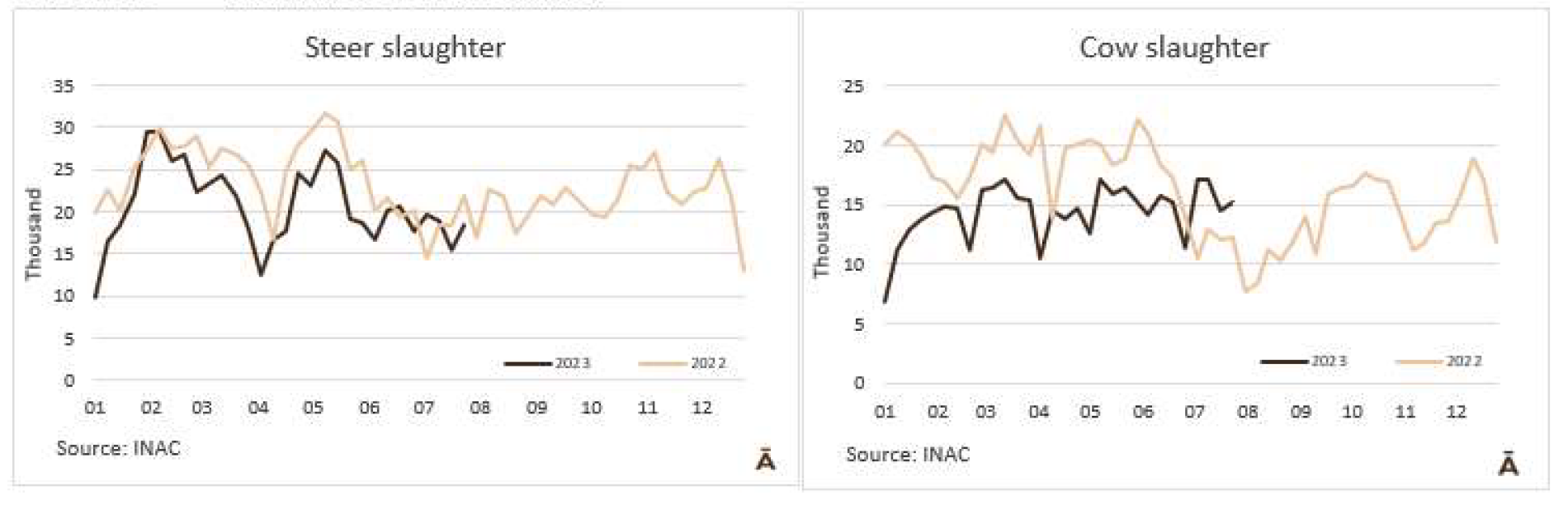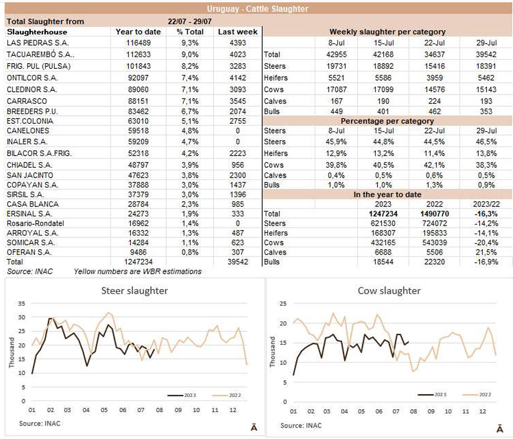 牛的屠宰量連續(xù)兩周保持在40000頭以下。INAC報(bào)告稱,在截至7月29日的一周內(nèi),有39542頭牛進(jìn)入工廠,比前一周(由于7月18日假期)多了近5000頭,但比去年同期減少了2%。隨著481配額活動(dòng)的開(kāi)始,被屠宰的公牛和小母牛的比例有所增加,而奶牛的比例有所下降。與前一周相比,公牛增加了19%達(dá)到了18391頭,小母牛增加了38%達(dá)到5462頭,而奶牛只增加了4%,數(shù)量為15143頭,占屠宰總數(shù)的38%,比前一周減少了4個(gè)百分點(diǎn)。屠宰量最多的工廠為Las Piedras(4393)、Ontilcor(4142)和Marfrig-Tacuarembo(4023)。Marfrig屠宰量是9871頭(每周增加13%),而其他兩個(gè)工廠屠宰了6828頭牛(每周減少4%)。今年7月有161731頭牛被屠宰,去年7月只有149300頭牛被屠宰,因此年度比較有所增加,這是前13個(gè)月沒(méi)有發(fā)生過(guò)的