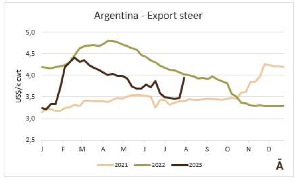 希爾頓市場(chǎng)阿根廷產(chǎn)品的價(jià)格在上周小幅反彈,這可能與該=地區(qū)待屠宰牛的價(jià)格回升有關(guān)。阿根廷牛臀腰肉為FOB 12600-12900美元/噸,比七天前高出約100美元
