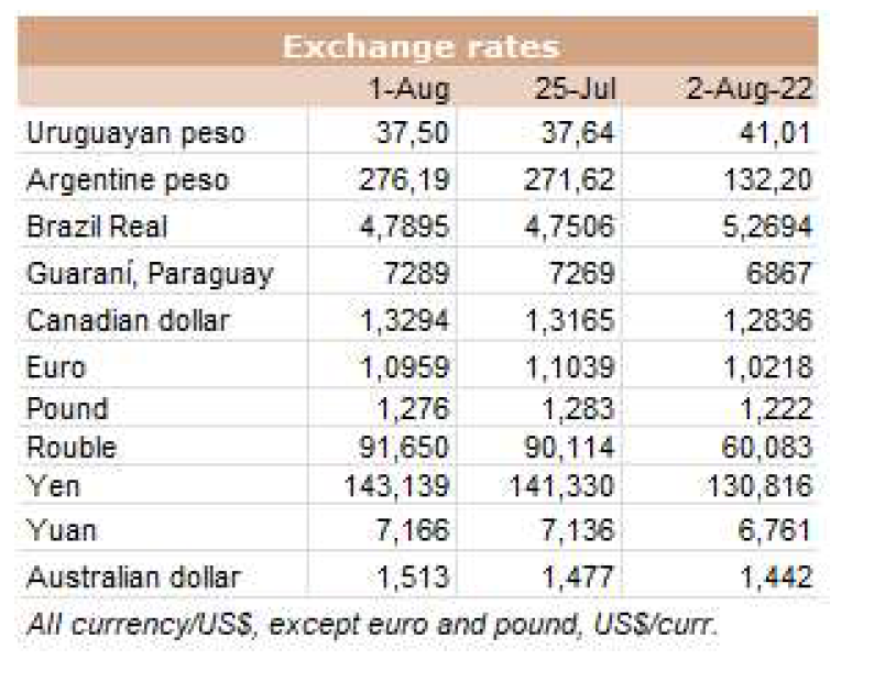 盡管上周(因雪關(guān)閉后)約700輛載有牛肉的卡車進(jìn)入了智利邊境(通常在15天內(nèi)進(jìn)入)。一位進(jìn)口商在與WBR對(duì)話時(shí)表示:“這種肉的管理和分銷速度非???。”在這種情況下,人們預(yù)計(jì)9月的國(guó)定假日會(huì)有一個(gè)銷量。該知情人士稱:“假期臨近時(shí),價(jià)格可能會(huì)上漲一點(diǎn)?!熬蜑趵缗?span>19-20分體來(lái)講,具體取決于切割和品牌的定價(jià)為5300-5500美元/噸之間”。與此同時(shí),巴拉圭一家出口商報(bào)告稱,該公司8月份完成了5600-5700美元的貨物交易?!昂?jiǎn)而言之,看起來(lái)非常不確定的前景開(kāi)始明朗起來(lái),”這位消息人士表示。