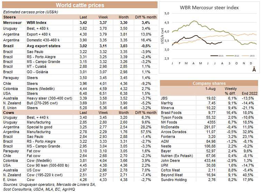 上周末,阿根廷農(nóng)場(chǎng)到屠宰場(chǎng)的價(jià)格大幅上漲,并推高了地區(qū)平均值,盡管巴西本周呈下跌趨勢(shì)。WBR南方共同市場(chǎng)公牛指數(shù)上漲5美分至每公斤酮體3.42美元,為10周來(lái)的最高值。