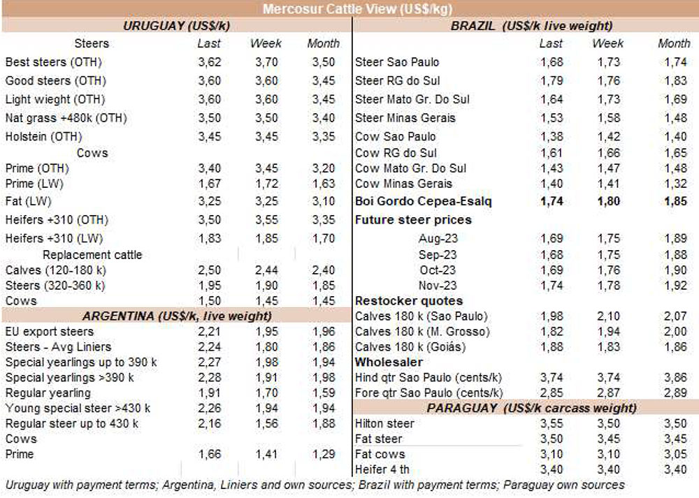 阿根廷出口公牛的價(jià)格本周爆炸式增長(zhǎng)了50美分至每公斤酮體4.30美元(包括9%的出口稅)。而巴西恰恰相反,那里的包裝公司被收購(gòu)以此壓低價(jià)格。出口州的平均每公斤損失9美分至每公斤3.02美元,成為該地區(qū)的最低價(jià)格參考值。烏拉圭的牛的價(jià)格也面臨下行壓力,主要是質(zhì)量最重、最好的公牛,價(jià)格為3.60美元左右。在巴拉圭,良好的飼料條件要求牛肉維持3.50美元左右的市場(chǎng)價(jià)格。