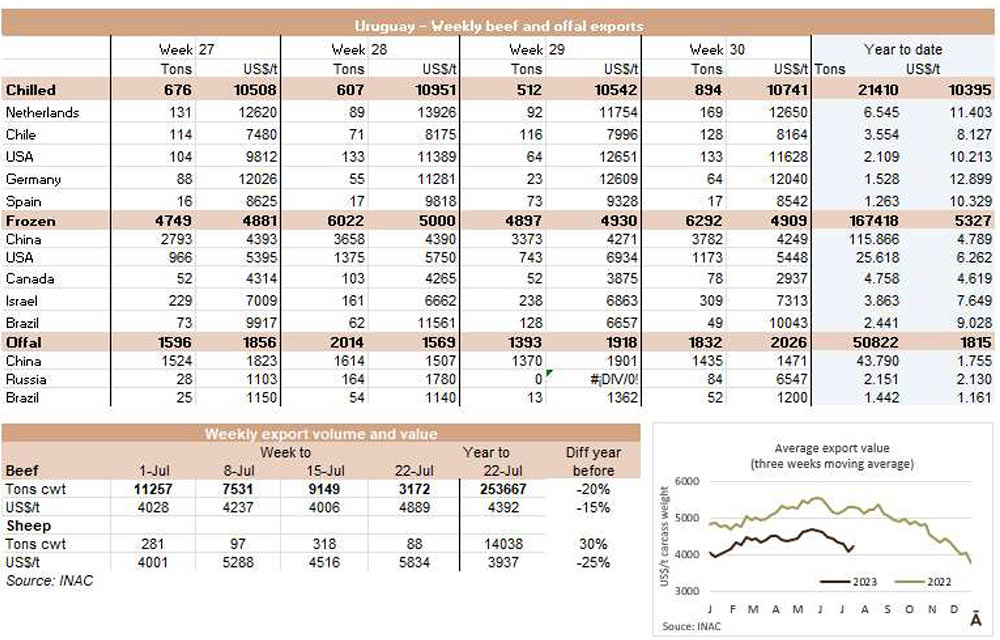 烏拉圭7月份出口了26038噸牛肉,和六月份的數(shù)據(jù)相似,比2022年7月增加了約1500噸。這是今年出口同比增長(zhǎng)的第一個(gè)月,平均出口價(jià)格為每噸5534美元,比上月下降了240美元(-4.2%),是今年迄今為止的最低月度平均值。