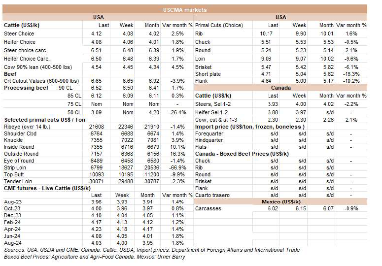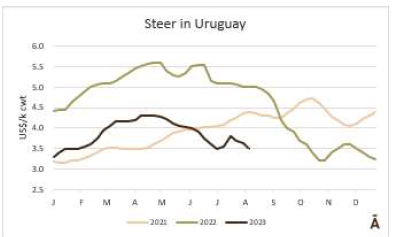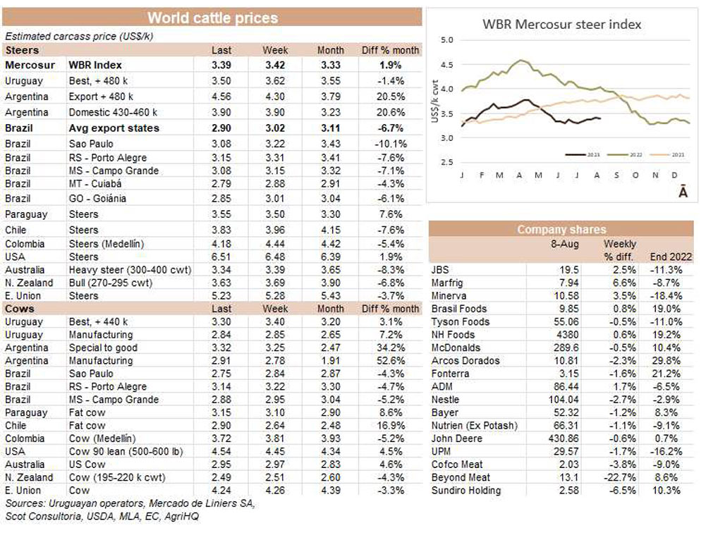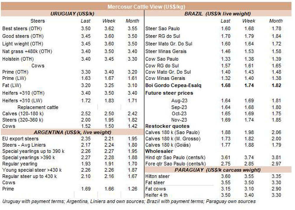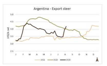 在阿根廷,價(jià)格繼續(xù)迅速上升??紤]官方匯率并增加9%的牛肉出口稅,本周出口公牛增加了26美分,上兩周增加了77美分,每公斤胴體重量為4.56美元。