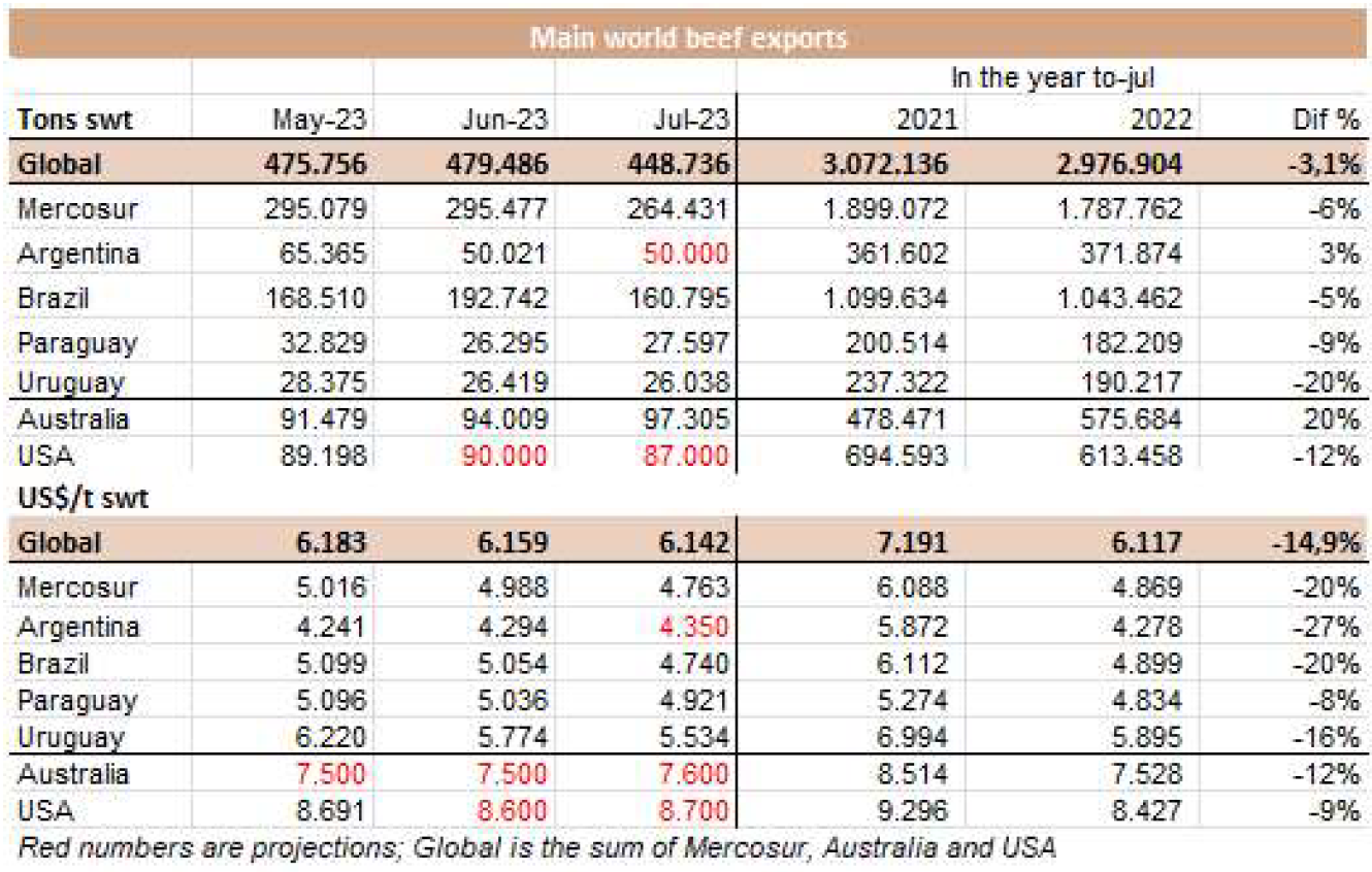 7月份對(duì)中國(guó)牛肉出口大幅下降,可以看出中國(guó)對(duì)牛肉需要的減弱。前一個(gè)月相比,降幅將在5至21萬噸左右。大部分牛肉,尤其是來自南方共同市場(chǎng),將于8月中旬至9月中旬抵港。與上月相比,7月份巴西對(duì)中國(guó)的出口減少了4.3萬噸,這是下降的主要原因。澳大利亞和烏拉圭的出口也有所下降,阿根廷的出口預(yù)計(jì)也出現(xiàn)了同樣的情況。美國(guó)農(nóng)業(yè)部預(yù)計(jì),中國(guó)今年將進(jìn)口350萬噸牛肉,這意味著每月進(jìn)口量約22.7萬噸牛肉,7月份的出口量低于這個(gè)數(shù)值。