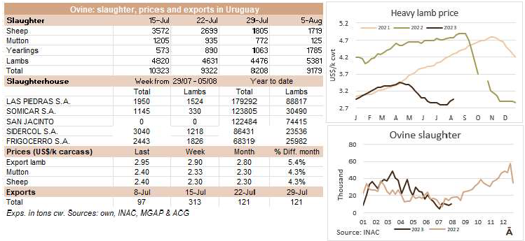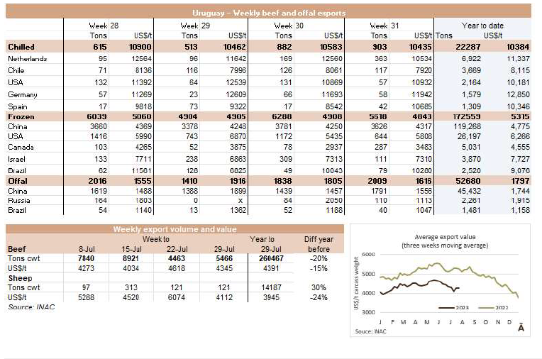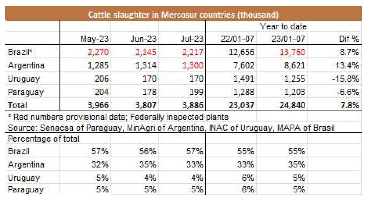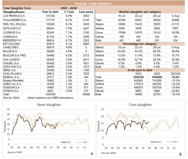 上周屠宰量大幅上升。INAC報(bào)告稱,截至8月6日,有45086頭牛進(jìn)入屠宰場(chǎng),比上一次增加了5500頭,是自5月中旬以來的最高值。屠宰的組成比例清楚地反應(yīng)了481配額。小母牛是增長(zhǎng)數(shù)量最多的,總共有7067頭,這是自2月份以來的最高值。本周,公牛增加2700頭達(dá)到了21112頭。不屬于配額的奶牛僅占屠宰量的36%,有16188頭。本周屠宰最多的工廠是Marfrig-Tacuarembo(5140)、Las Piedras(4853)和Ontilcor(4247)。7月份屠宰量是169558頭牛,同比增長(zhǎng)了13.6%。這是自2022年5月以來,年度牛屠宰量首次增加。