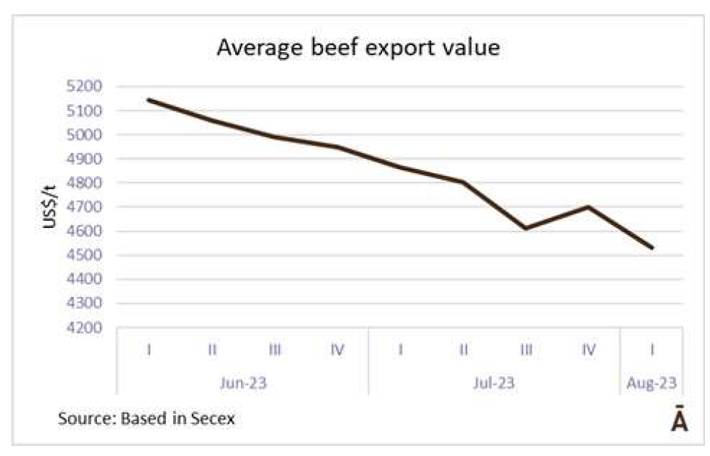 據(jù)外貿(mào)部(Secex)報(bào)告,8月前四個(gè)工作日,巴西出口了41267噸牛肉,平均價(jià)格為4532美元/噸。平均日產(chǎn)量為10317噸,為6月第一周以來的最高值。自6月初以來平均出口值呈下降趨勢(shì),價(jià)格下跌了12%,即613美元/噸。