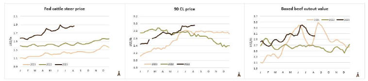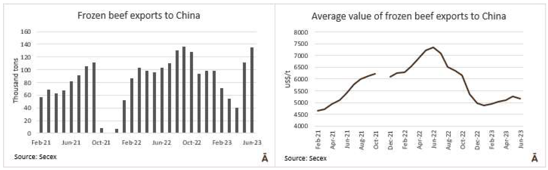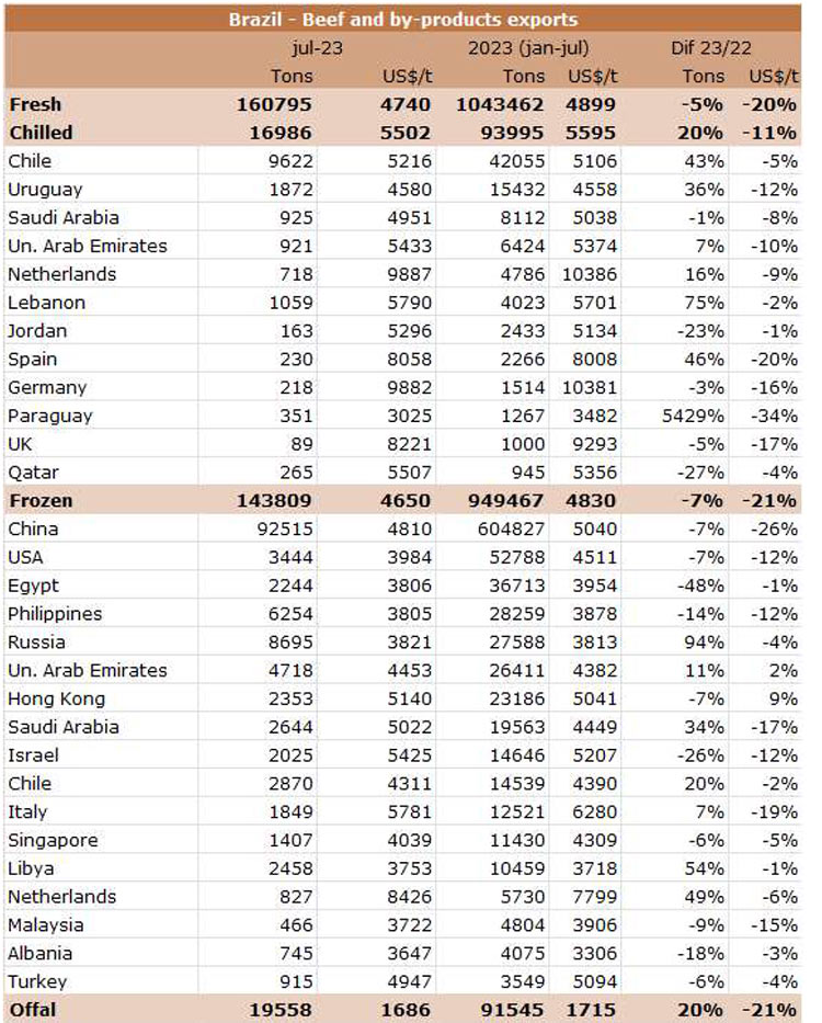 7月份,巴西對(duì)中國(guó)的冷凍牛肉平均出口價(jià)格為4810美元/噸,比6月份的平均出口價(jià)格每噸低350美元(-6.8%),為16個(gè)月前2021年3月以來的最低值。7月份中國(guó)出口量環(huán)比下降4.3萬噸至92515噸。無論如何,到目前為止,中國(guó)仍然是巴西冷凍牛肉的主要出口國(guó),占比為64%。本月冷凍牛肉第二大目的地是俄羅斯(8695噸)。