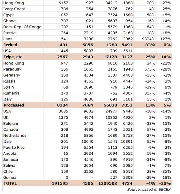中國(guó)需求疲軟導(dǎo)致巴西出口商增加了對(duì)南美市場(chǎng)的出口比例。截至到7月,智利和烏拉圭的冰鮮牛肉出口同比分別增長(zhǎng)了43%和36%。這導(dǎo)致今年的冰鮮出口量增長(zhǎng)了20%,而目前冷凍出口量每年下降7%。四個(gè)出口量下降的主要目的地分別是:中國(guó)(-7%)、美國(guó)(-7%)、埃及(-48%)和菲律賓(-14%)。