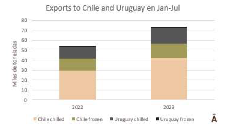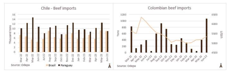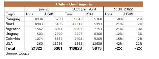 由于智利牛肉進(jìn)口牛價(jià)格的下降,巴西牛肉在國(guó)際市場(chǎng)上表現(xiàn)出競(jìng)爭(zhēng)力。根據(jù)Odepa的數(shù)據(jù),6月份,8903噸巴西牛肉抵達(dá)智利,這是今年迄今為止的最高月度產(chǎn)量,與巴拉圭的牛肉數(shù)量持平。來自哥倫比亞的牛肉量也大幅增加,達(dá)到1074噸,是過去至少兩年來的最高出口量。2023年上半年,智利進(jìn)口了59645噸牛肉,比2022年同期減少了8%。