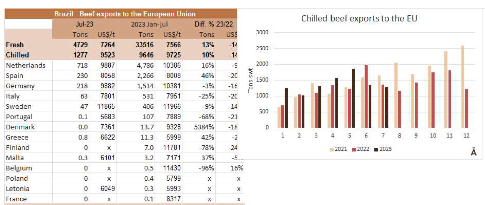 巴西向歐盟國(guó)家出口了1277噸冰鮮牛肉,比6月份減少了70噸,是自2月份以來的最低出口量。當(dāng)月凍結(jié)出口累計(jì)3452噸,比6月份增加464噸。