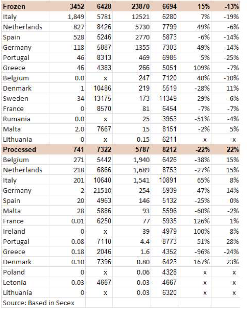 在下周日阿根廷(Paso)初選前幾天,牛屠宰量減少導(dǎo)致歐洲希爾頓價(jià)格瘋狂上漲(請(qǐng)看阿根廷)。上周末,阿根廷臀腰肉價(jià)格為FOB 13300-13700美元之間,而本周價(jià)格則達(dá)到了FOB 14000美元。一位貿(mào)易商稱:“本周我停止了購(gòu)買。歐洲需求并不能證明這些高價(jià)是合理的,肉類將在10月中旬抵達(dá),而10月中旬并不是假期。”據(jù)知情人士透露,烏拉圭利用歐洲進(jìn)口冰鮮市場(chǎng)的價(jià)格調(diào)整,希爾頓牛臀腰肉的價(jià)格達(dá)到12500-12800美元/噸。