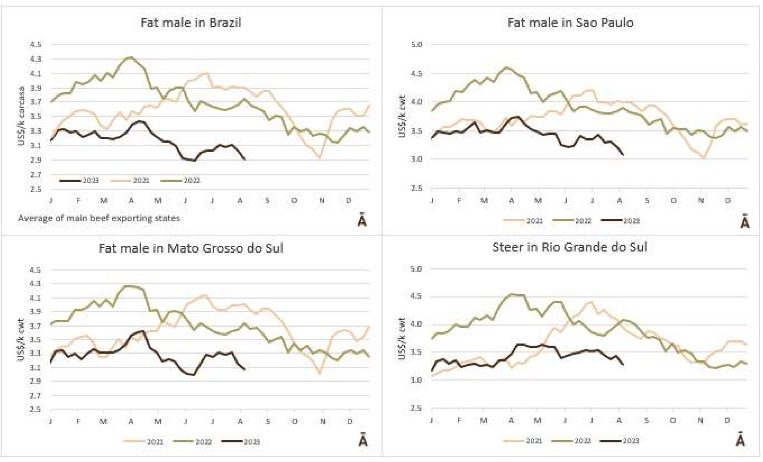 受巴西和烏拉圭牛價(jià)下跌的壓力,盡管阿根廷價(jià)格再次出現(xiàn)強(qiáng)勁上升趨勢(shì),但南方共同市場(chǎng)的閹肉平均價(jià)格本周下跌。南方共同市場(chǎng)公牛指數(shù)下跌3美分至每公斤胴體3.39美元。主要是巴西,雷亞爾參考值的下降和2.4%的匯率貶值加在一起,肥牛本周下降了12美分至每公斤酮體2.90美元。