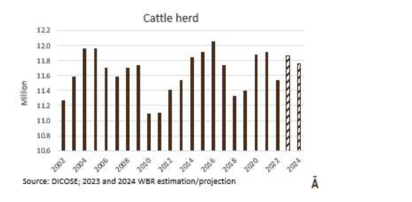 事實(shí)上,2022/23財(cái)政年度的牛庫存有所增加。畜牧部在9月份報(bào)告初步數(shù)據(jù)時(shí),顯示這個(gè)數(shù)字肯定會(huì)比去年多出30-35萬只。當(dāng)畜牧部在9月份報(bào)告初步數(shù)據(jù)時(shí),這個(gè)數(shù)字肯定會(huì)比去年多出300-35萬只。一方面,屠宰量急劇下降,從2021/22年度的274萬頭下降到215萬,減少了57萬頭牛??偟膩碚f,鑒于2022年下半年活牛產(chǎn)量幾乎為零,除上半年增長(zhǎng)外,兩年的活牛出口略有收縮。除此之外,還有對(duì)良好產(chǎn)仔和斷奶的預(yù)期。根據(jù)INIA妊娠研討會(huì)的數(shù)據(jù),2022年的妊娠率達(dá)到了80%。因此,隨著懷孕和斷奶的時(shí)間減少,6月30日統(tǒng)計(jì)的小牛數(shù)量幾乎肯定超過了290萬頭??紤]到出欄和小牛的進(jìn)入,牛群將增加約30-35萬頭達(dá)到約1186萬頭的數(shù)量。2023/24財(cái)政年,受干旱的影響,牛群數(shù)量很可能會(huì)減少。今年的INIA妊娠研討會(huì)報(bào)告稱,與前一年相比,妊娠率下降了9個(gè)百分點(diǎn),因此斷奶率將略高于60%。明年6月30日的小牛數(shù)量肯定會(huì)減少約30萬達(dá)到260萬頭。2023/24年初的國(guó)際市場(chǎng)狀況和對(duì)中國(guó)經(jīng)濟(jì)發(fā)展的預(yù)期不容樂觀,因?yàn)閺?qiáng)烈的購(gòu)買壓力將加快屠宰速度,因此屠宰量可能會(huì)接近200萬頭牛,2023/24財(cái)政年度末的牛群數(shù)量可能會(huì)減少約10萬頭。