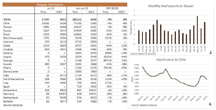 根據(jù)Senacsa的數(shù)據(jù),巴拉圭7月份以4921美元/噸的平均價(jià)格出口了27597噸牛肉。比6月份增加了1300噸,同比減少了8000噸(-22%)。與上個(gè)月相比,每噸的平均價(jià)格下降了100美元多一點(diǎn),這是連續(xù)第二個(gè)月出現(xiàn)收縮,落后于2月至5月的持續(xù)上升趨勢(shì),在此期間,價(jià)格回升了500美元/噸。對(duì)于智利的出口價(jià)格的下降,巴拉圭主要客戶這個(gè)月平均價(jià)格下降了180美元/噸。作為巴拉圭牛肉的第二大目的國(guó)的臺(tái)灣,今年迄今為止的出貨量增長(zhǎng)了3%,而年出口總額則下降了9%。