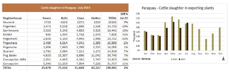 巴拉圭上半年的牛屠宰量月同比都低于2022年,下半年開始有所好轉(zhuǎn)。Senacsa報(bào)告稱,近19.9萬頭牛進(jìn)入屠宰場(chǎng),比2022年7月多了近4000頭。良好的天氣和飼料條件可能會(huì)加快屠宰速度,因此下半年的屠宰動(dòng)態(tài)可能會(huì)高于2022年。最大的屠宰廠集團(tuán)Minerva,在四家屠宰廠加工了78544頭牛(占總數(shù)的39%),而管理三家屠宰廠的Concepcion集團(tuán)屠宰了61225頭牛(31%)。