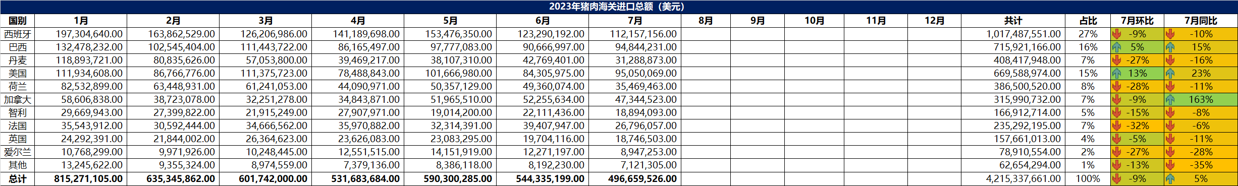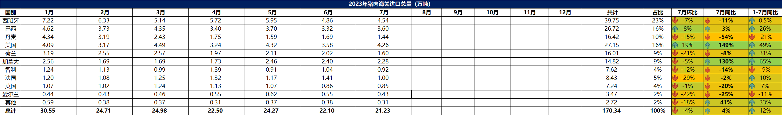 2023年7月中國(guó)主港豬肉進(jìn)口量21.23萬(wàn)噸,環(huán)比減少4%,同比增加4%。進(jìn)口金額4.96億美元,環(huán)比下降9%,同比上漲5%。1-7月中國(guó)主港豬肉進(jìn)口總量170.34萬(wàn)噸,同比增加12%。進(jìn)口總額42.15億美元,同比增長(zhǎng)27.9%。從進(jìn)口國(guó)別看,1-7月,從西班牙進(jìn)口豬肉總量39.75萬(wàn)噸,占進(jìn)口總量的23%,同比減少11%。從美國(guó)進(jìn)口豬肉27.15萬(wàn)噸,占比16%,超過(guò)巴西成為中國(guó)主港豬肉進(jìn)口第二大來(lái)源國(guó),同比增加149%。從巴西進(jìn)口豬肉26.72萬(wàn)噸,占比16%,同比增加3%。從丹麥進(jìn)口豬肉16.42萬(wàn)噸,占比10%,同比減少54%。從荷蘭進(jìn)口豬肉16.01萬(wàn)噸,占比9%,同比減少8%。從加拿大進(jìn)口豬肉14.82萬(wàn)噸,占比9%,同比增長(zhǎng)130%。中國(guó)主港進(jìn)口豬肉區(qū)域分布發(fā)生明顯變化,從歐洲進(jìn)口豬肉數(shù)量同比均有大幅減少,而從美國(guó)和加拿大進(jìn)口豬肉數(shù)量同比增長(zhǎng)驚人。從進(jìn)口品項(xiàng)看,1-7月,進(jìn)口其他凍豬肉78.73萬(wàn)噸,占比46%。進(jìn)口其他凍豬雜碎64.59萬(wàn)噸,占比38%。主塊肉和油脂類進(jìn)口量分別26.64萬(wàn)噸和0.35萬(wàn)噸,兩個(gè)品項(xiàng)進(jìn)口量之和占比16%。