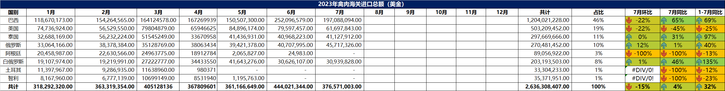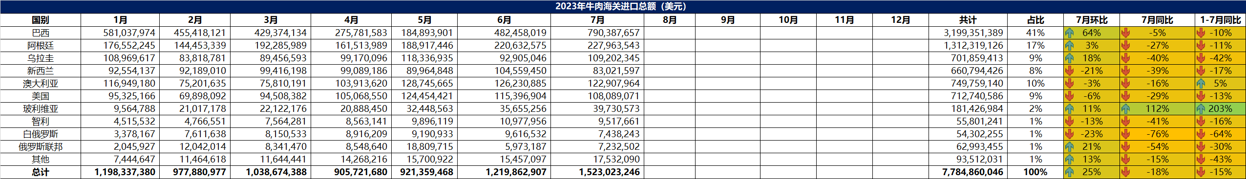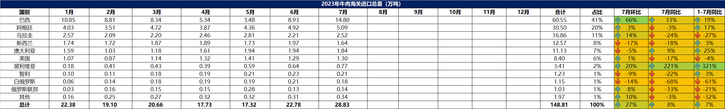 2023年7月中國(guó)主港牛肉進(jìn)口量28.83萬(wàn)噸,環(huán)比增長(zhǎng)27%,同比增長(zhǎng)8%。進(jìn)口金額15.23億美元,環(huán)比增長(zhǎng)25%,同比下滑18%。1-7月中國(guó)主港牛肉進(jìn)口總量148.81萬(wàn)噸,同比增長(zhǎng)7%。進(jìn)口總金額77.84億美元,同比下滑15%。從進(jìn)口國(guó)別看,1-7月,從巴西進(jìn)口牛肉數(shù)量60.55萬(wàn)噸,同比增長(zhǎng)19%,占進(jìn)口總量的41%。從阿根廷進(jìn)口牛肉數(shù)量30.50萬(wàn)噸,同比增長(zhǎng)17%,占比20%。從烏拉圭進(jìn)口牛肉數(shù)量16.86萬(wàn)噸,同比減少27%,占比11%。從新西蘭進(jìn)口牛肉數(shù)量12.57萬(wàn)噸,同比增長(zhǎng)3%,占比8%。從澳洲進(jìn)口牛肉數(shù)量11.13萬(wàn)噸,同比增長(zhǎng)25%,占比7%。玻利維亞牛肉自去年4月暫停牛肉出口,于去年11月恢復(fù)牛肉出口,因此今年1-7月從玻利維亞進(jìn)口牛肉同比增長(zhǎng)321%。從進(jìn)口品項(xiàng)看,1-7月,中國(guó)主港進(jìn)口凍帶骨牛肉24.23萬(wàn)噸,進(jìn)口凍去骨牛肉124.57萬(wàn)噸。
