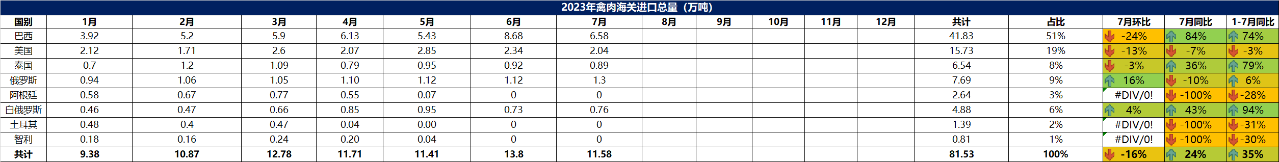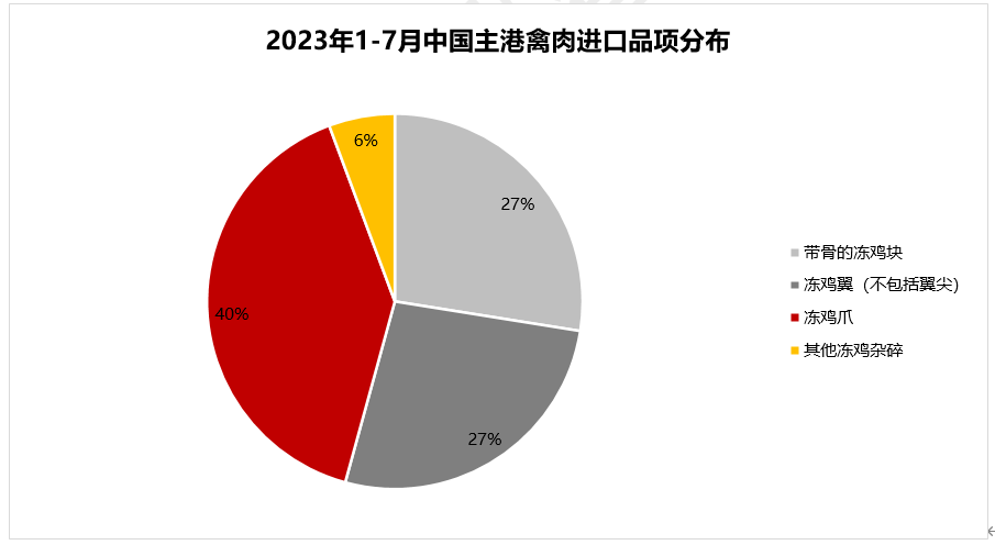2023年7月中國(guó)主港進(jìn)口禽肉數(shù)量11.58萬(wàn)噸,環(huán)比減少16%,同比增長(zhǎng)24%。進(jìn)口金額3.76億美元,環(huán)比下滑15%,同比上漲4%。1-7月,中國(guó)主港進(jìn)口禽肉共計(jì)81.53萬(wàn)噸,同比增長(zhǎng)35%。進(jìn)口總額26.36億美元,同比增長(zhǎng)32%。從進(jìn)口國(guó)別看,1-7月,從巴西進(jìn)口禽肉41.83萬(wàn)噸,同比增長(zhǎng)74%,占比51%。從美國(guó)進(jìn)口禽肉15.73萬(wàn)噸,同比減少3%,占比19%。從俄羅斯進(jìn)口禽肉7.69萬(wàn)噸,同比增長(zhǎng)6%,占比9%。從泰國(guó)進(jìn)口禽肉6.54萬(wàn)噸,同比增長(zhǎng)79%,占比8%。從進(jìn)口品項(xiàng)看,凍雞爪進(jìn)口總量32.67萬(wàn)噸,占比40%。帶骨的凍雞塊進(jìn)口總量22.454萬(wàn)噸,占比27%。凍雞翼(不包括翼尖)進(jìn)口總量21.80萬(wàn)噸,占比27%。其他凍雞雜碎進(jìn)口總量4.64萬(wàn)噸,占比6%。