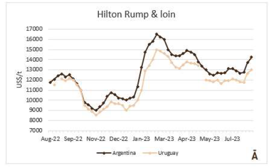 上周,希爾頓配額范圍內(nèi)的冰鮮市場(chǎng)再次走強(qiáng),阿根廷的臀腰肉價(jià)格在FOB 14000-14500美元之間。一位歐洲貿(mào)易商評(píng)論道:“目前,歐洲沒(méi)有足夠的產(chǎn)品,這也有助于價(jià)格上漲。此外,市場(chǎng)上的肉類數(shù)量有限,因此需求狀況良好?!?span>