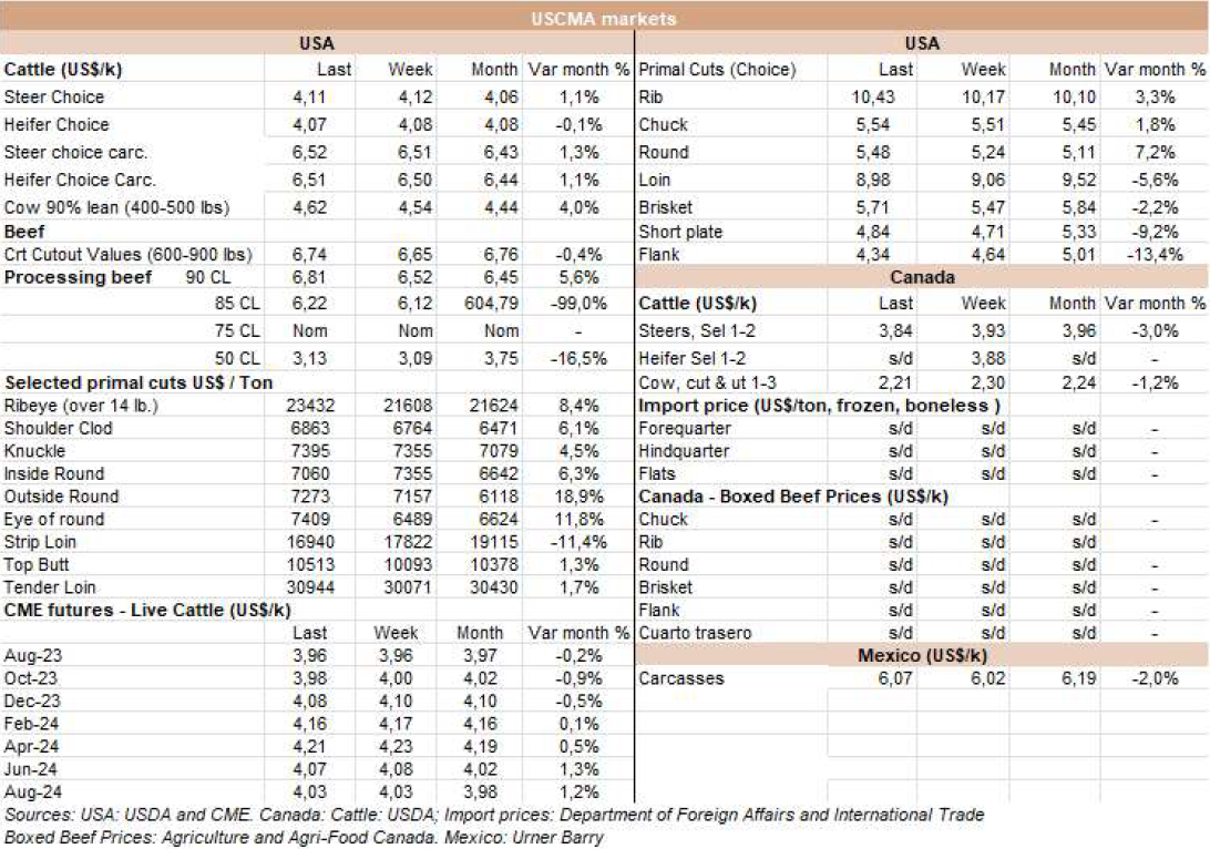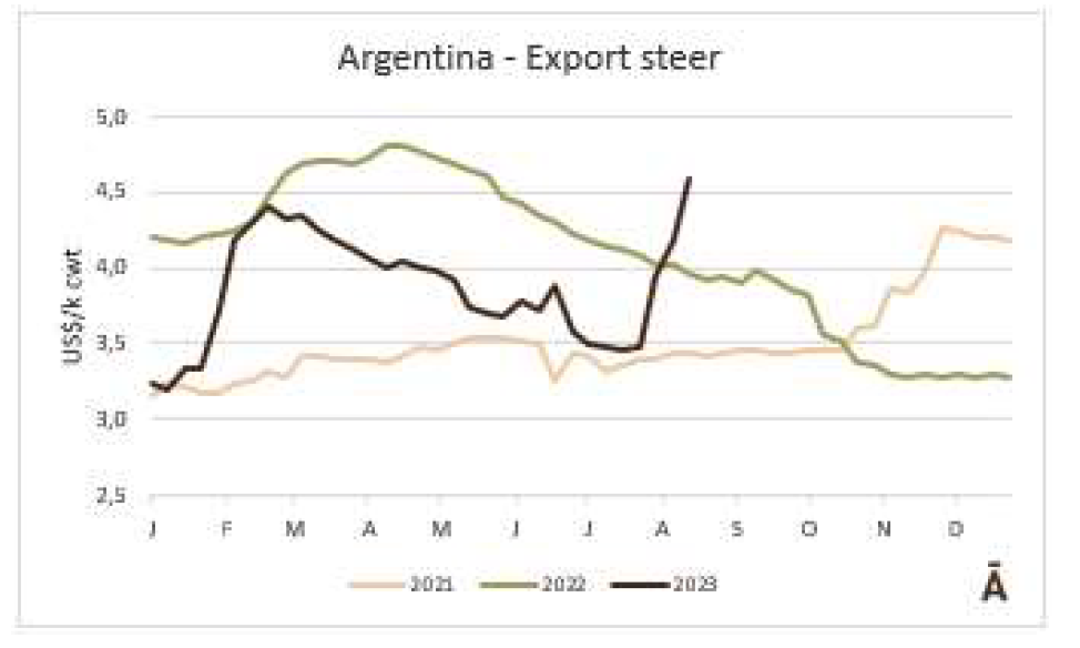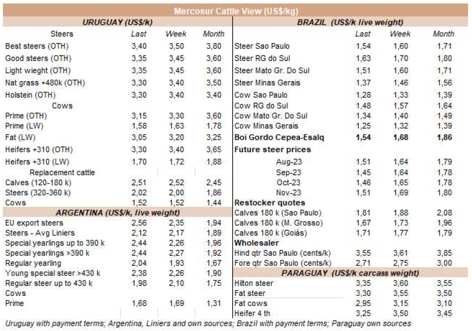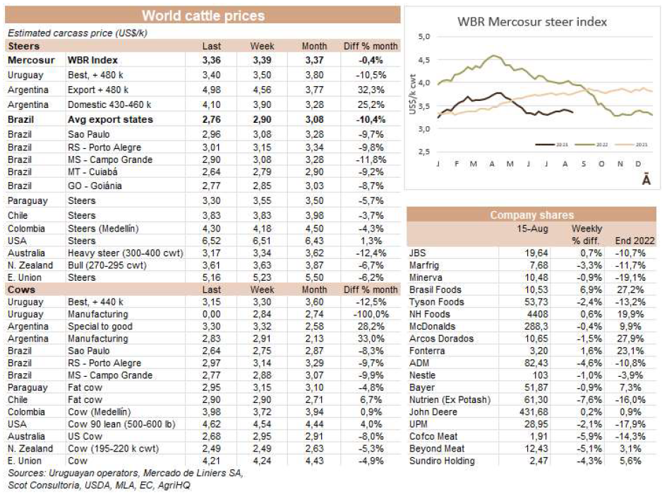 根據(jù)外貿(mào)部的數(shù)據(jù),8月第二周,巴西以每噸4482的平均價(jià)格出口了42077噸牛肉。平均價(jià)格為4500美元/噸,比6月第一周的平均價(jià)格每噸低600美元(-13%)。在8月的前9個(gè)工作日,巴西以每噸4507的平均價(jià)格出口了83344噸牛肉。預(yù)計(jì)月底的產(chǎn)量將略低于20萬(wàn)噸,這意味著與2022年8月的20.3萬(wàn)噸相比將略有下降。