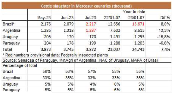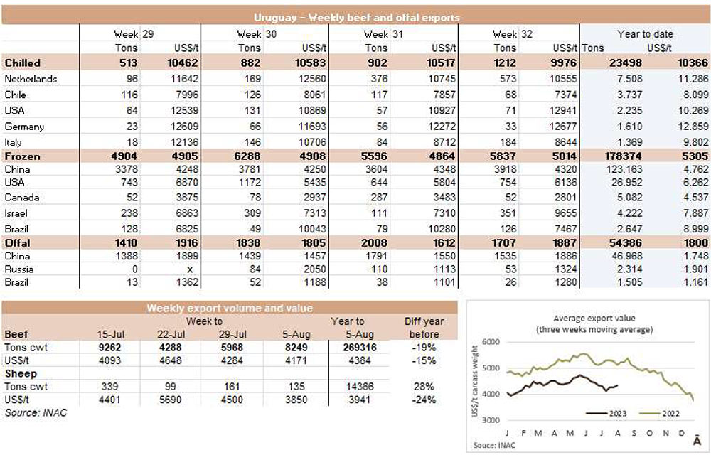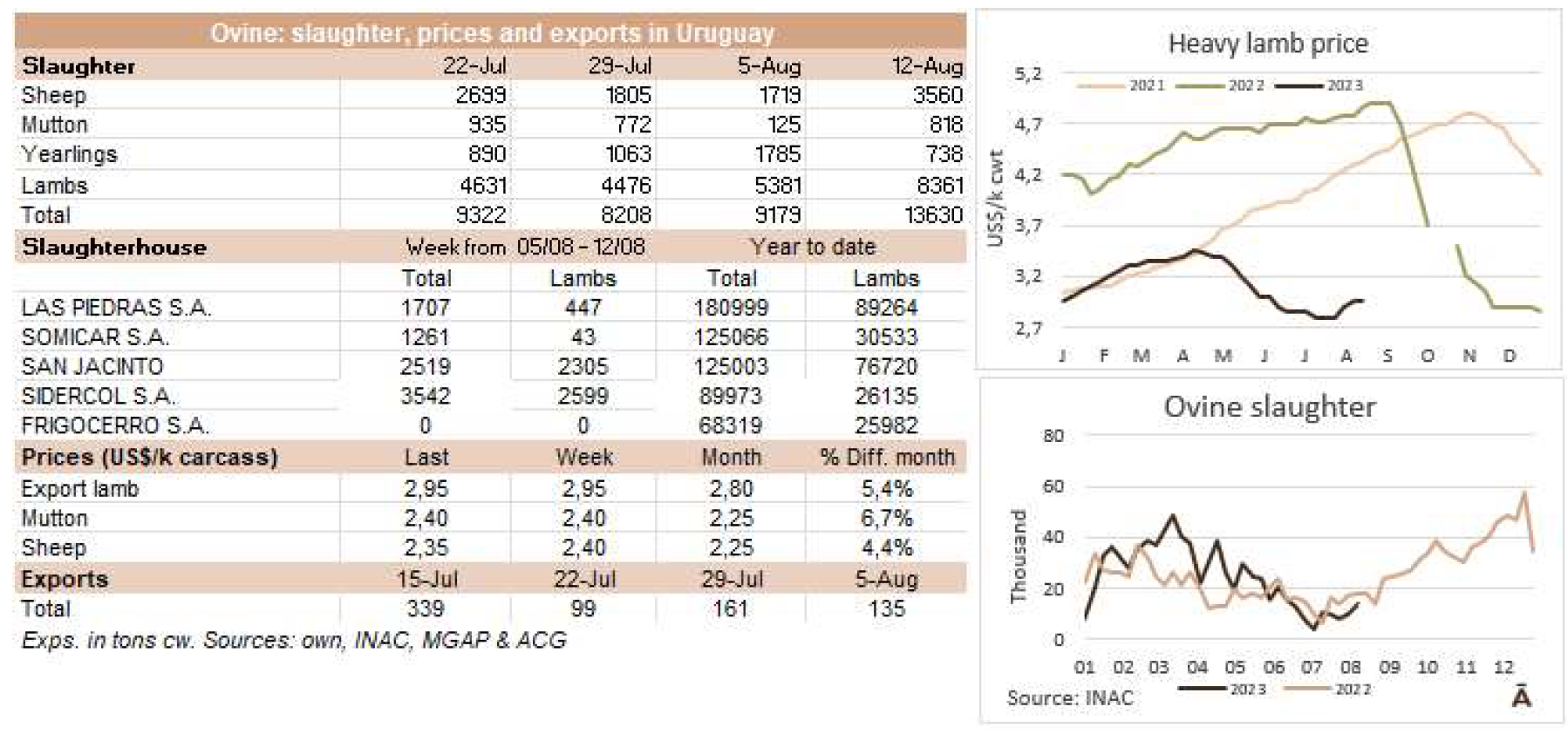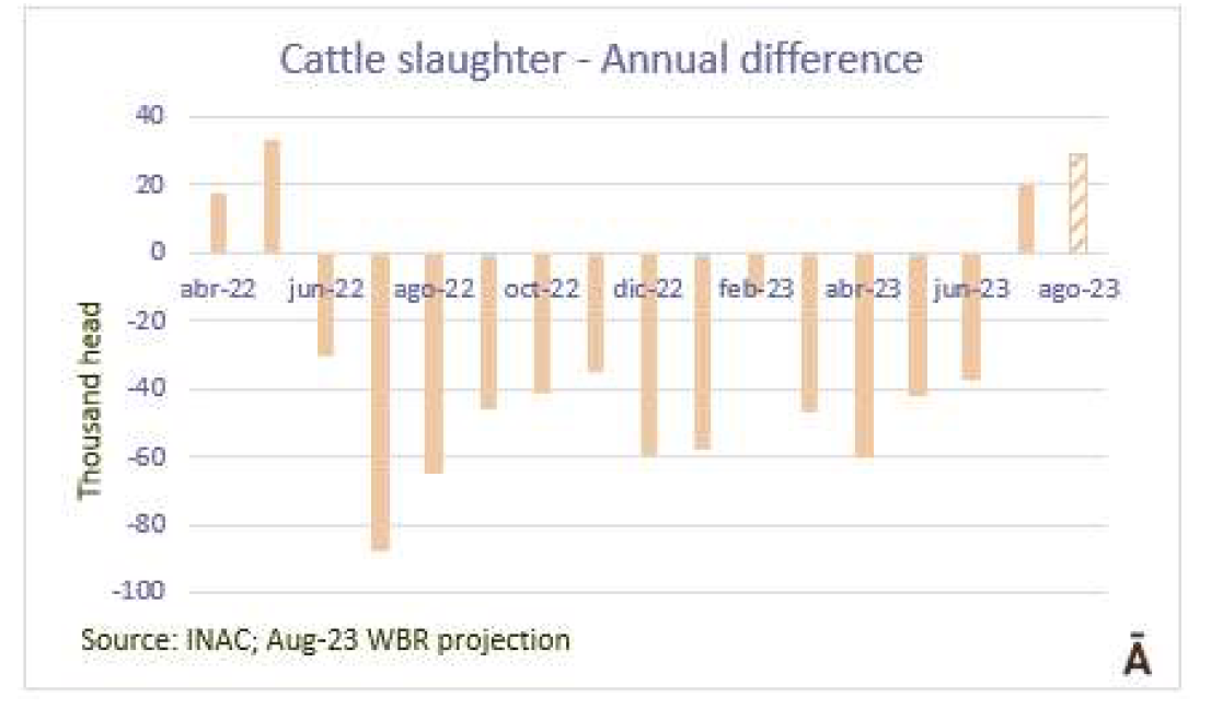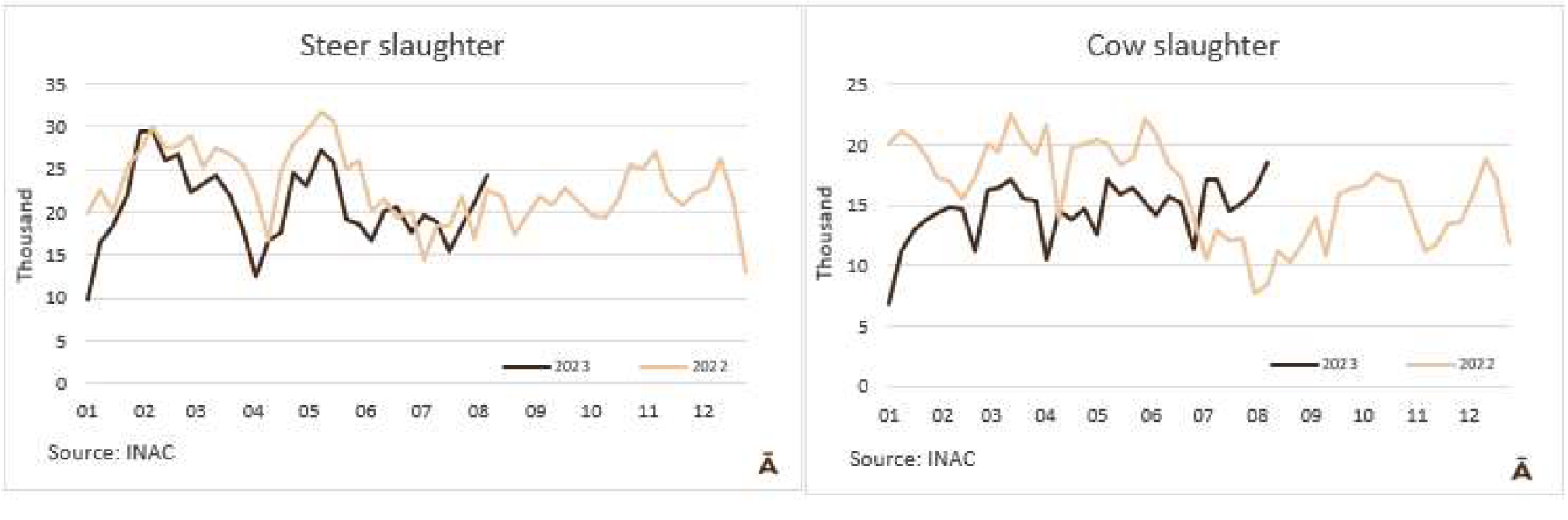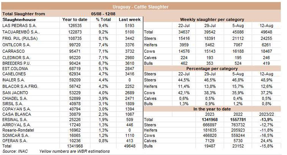 上周的牛屠宰量接近5萬(wàn)頭,是自5月第二周以來(lái)數(shù)量最多的一周,當(dāng)時(shí)屠宰場(chǎng)也在積極為481配額窗口工作。INAC報(bào)告稱,在截至8月12日的一周內(nèi),有49648頭牛進(jìn)入工廠,比前一周增加了10%,比去年同期的37000頭增加了33%。屠宰量最大是Las Piedras(5193)、Marfrig-Tacuaremb6(5100)和Minerva Carrasco(3732)。擁有三個(gè)工廠的Marfrig屠宰了10927頭牛(周比較為-255頭),而同樣擁有三個(gè)工廠的Minerva屠宰了10590頭牛(周增加3552頭)。Marfrig lnaler本周再次開(kāi)始恢復(fù)生產(chǎn),而Cledinor下周將進(jìn)入許可期。就Minerva而言,從下周開(kāi)始,它將進(jìn)入卡拉斯科工廠的許可期。截至8月,共有86907頭牛被屠宰,比去年同期多36%。事實(shí)上,牛的屠宰量將連續(xù)第二個(gè)月高于2022年。