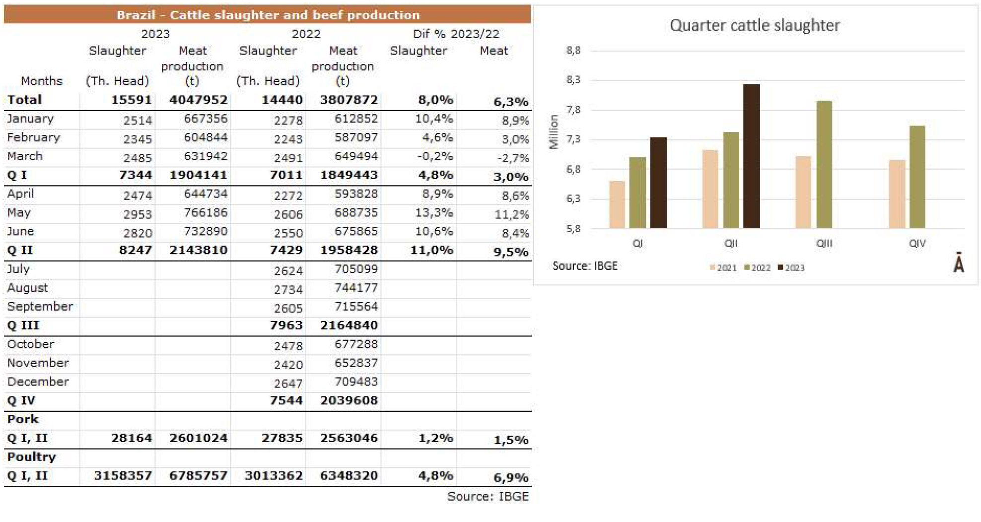 根據(jù)IBGE發(fā)布的畜牧業(yè)生產(chǎn)統(tǒng)計(jì)的初步結(jié)果,2023年第二季度,巴西有825萬(wàn)頭牛在某種類型的衛(wèi)生檢查下被屠宰。與2022年第二季度相比,這一數(shù)量增長(zhǎng)了11%,與2023年第一季度相比增長(zhǎng)了12.3%;與前三個(gè)月相比,增加了90.3萬(wàn)頭。2023年第二季度214萬(wàn)噸牛肉胴體的產(chǎn)量,意味著與上年同期相比增長(zhǎng)9.5%,與2023年第一季度相比增長(zhǎng)12.6%。由于屠宰量的增加是由于被送往屠宰場(chǎng)的雌性數(shù)量增加,因此酮體的重量往往會(huì)減少。該季度平均體重為260公斤,比2022年同期減少3.7公斤。與此同時(shí),豬肉產(chǎn)量總計(jì)130萬(wàn)噸,同比下降0.3%,而家禽產(chǎn)量增加330萬(wàn)噸,同比增長(zhǎng)7.2%。