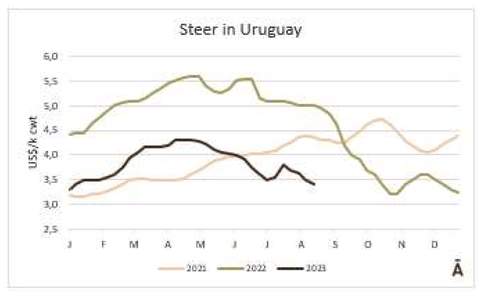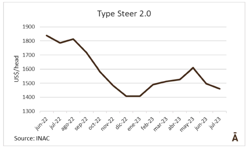 INAC 閹牛類型價(jià)值2.0在6月份跌了100美元以上后,7月份每頭又下跌36美元至1461美元。INAC閹牛類型價(jià)值預(yù)計(jì)了銷(xiāo)售烏拉圭特質(zhì)公牛所有產(chǎn)品中獲得的收入,并按比例考慮了在國(guó)外和當(dāng)?shù)厥袌?chǎng)的布局。由于出口和國(guó)內(nèi)市場(chǎng)胴體價(jià)格下跌導(dǎo)致閹牛類型價(jià)值下降。另一方面,內(nèi)臟和副產(chǎn)品的價(jià)值以及生皮的價(jià)格也保持穩(wěn)定。7月份,公牛的價(jià)格下降了5.1%(61美元)至1133美元/頭。另一方面,工業(yè)增加值在月度比較中每頭回升25美元(+8.3%)。