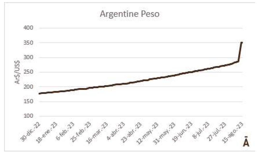 周日的選舉結(jié)果顯示,得票最多的候選人是哈維爾·米利,他是一位經(jīng)濟(jì)學(xué)家,在2021年之 前沒(méi)有政治生涯,提出了極端自由主義的建議。周日,被稱為“加密貨幣”的金融美元上漲了約10%。周一,根據(jù)國(guó)際貨幣基金組織發(fā)放資金的要求,政府將阿根廷比索貶值22%,以縮小其與自由美元之間超過(guò)100%的匯率差距。然而,隨著非官方匯率升至700比索以上,這一差距立即再次擴(kuò)大。所有這些不確定性,在一個(gè)更加微妙的情況下,導(dǎo)致所有行業(yè)的銷(xiāo)售額普遍下降。昨天,政府與超市和食品公司召開(kāi)緊急會(huì)議,試圖阻止價(jià)格上漲。