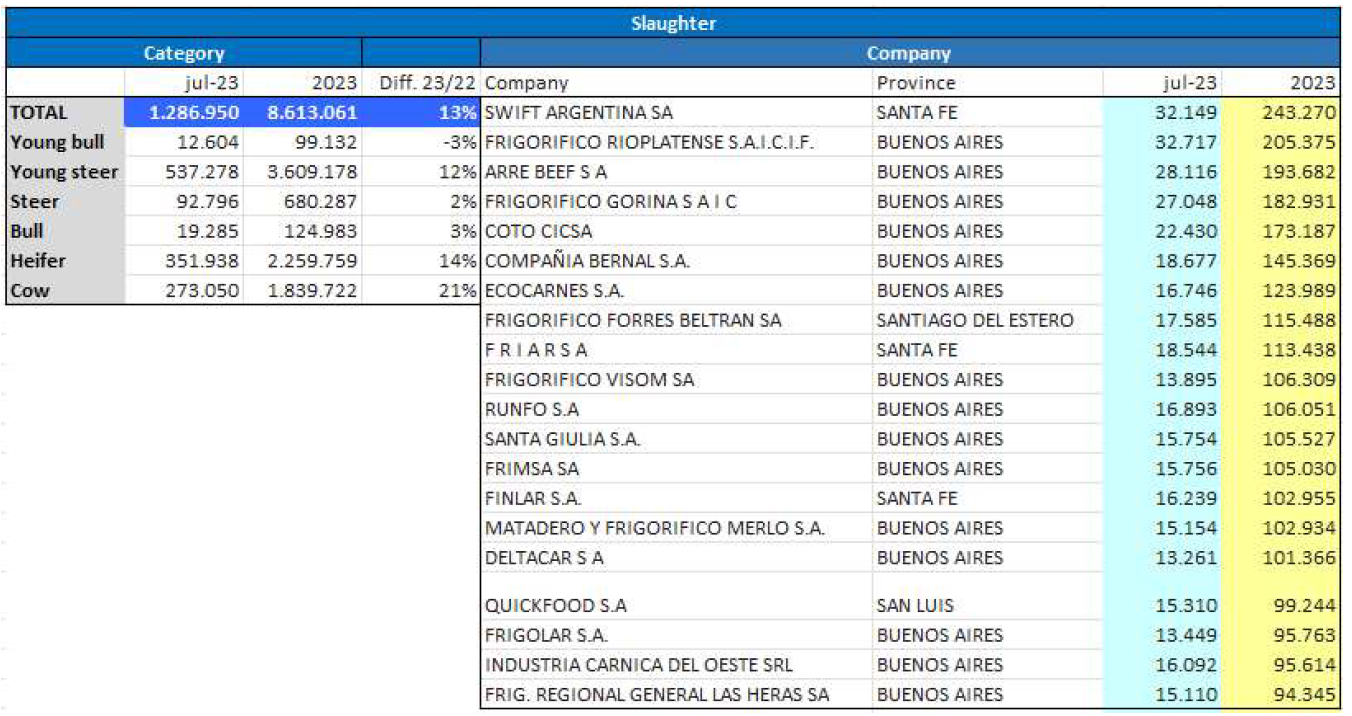 7月份,共屠宰129萬(wàn)頭牛,比上月減少2%,比去年同月增加16%.根據(jù)官方數(shù)據(jù)。在今年的前7個(gè)月,861萬(wàn)頭牛被屠宰,年增長(zhǎng)率為13%,這是自2009年大清算以來(lái)的最大增幅,該清算使該國(guó)的牛存欄減少了20%。與2022年相比,2023年的增長(zhǎng)尤其體現(xiàn)在屠宰量增長(zhǎng)了21%,然后是小母牛增長(zhǎng)了14%,其次是幼牛,年增長(zhǎng)了12%。7月份,母牛屠宰量占總數(shù)的48.5%以上。今年到目前為止,這一比例約為47.5%,而2022年同期為46%。