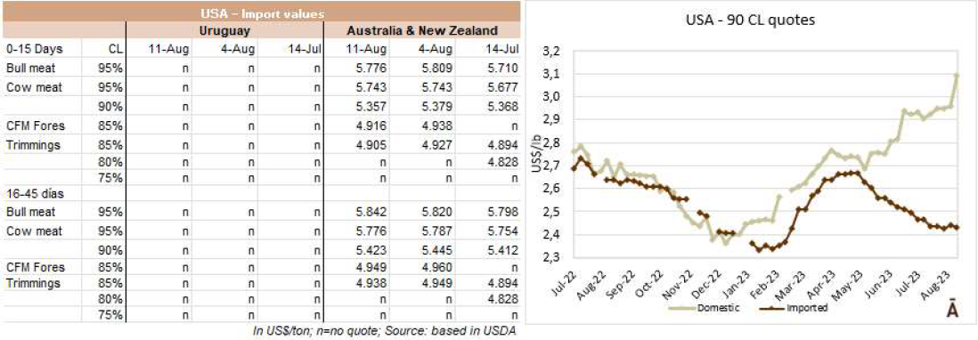 上周,美國(guó)進(jìn)口市場(chǎng)價(jià)格沒(méi)有發(fā)生大的變化。根據(jù)一位貿(mào)易商的說(shuō)法,配額范圍內(nèi)的烏拉圭90CL牛前,參考價(jià)格仍在CFR 4550美元左右。智利牛肉市場(chǎng)的大型零售企業(yè)正爭(zhēng)分奪秒地試圖淘汰9月初到期的牛肉。據(jù)消息人士透露,巴西和巴拉圭的19分體價(jià)格為CIF 5300美元至5400美元之間。另一方面這兩個(gè)供應(yīng)商第一季度的牛前價(jià)格分別為4900-5000美元。