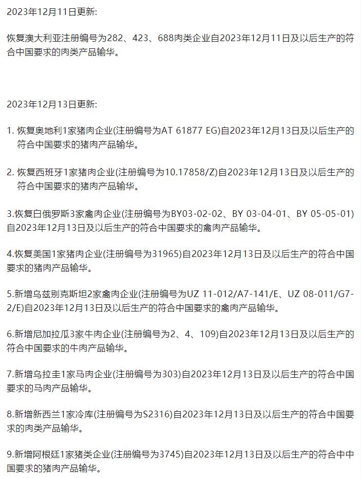 符合評估審查要求的國家或地區(qū)輸華肉類產(chǎn)品名單(2023年12月13日更新)