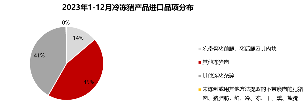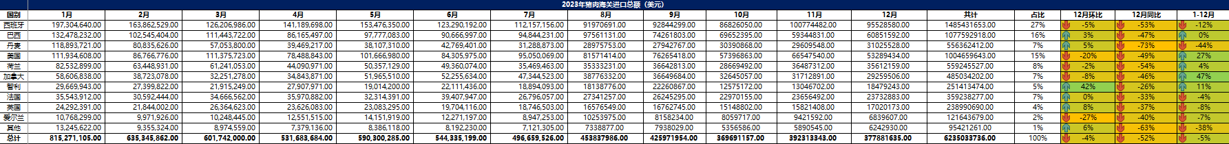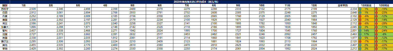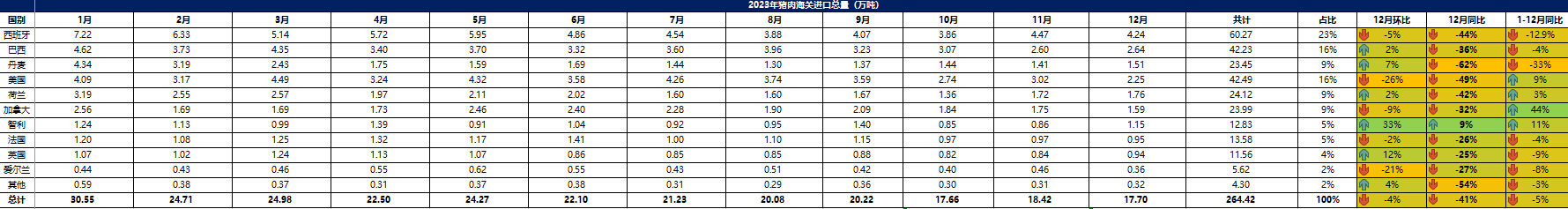2023 年 12月中國主港豬肉進口量17.7萬噸,環(huán)比下降4%,同比減少41%。1-12月主港豬肉進口量 264.42萬噸,同比下降5%。從進口國別看,其中,從西班牙進口豬肉共計60.27萬噸,同比減少12.9%,占比 23%。從美國進口豬肉共計42.49萬噸,同比增加9%,占比 9%。從巴西進口豬肉共計42.23萬噸,同比持平,占比 16%。從丹麥進口豬肉共計 23.45萬噸,同比減少33%。從進口品項看,1-12月,凍帶骨豬前腿、豬后腿及其肉塊進口量 36.41萬噸,占比 14%。其他凍豬肉進口量117.62萬噸,占比 45%。其他凍豬雜碎109.6萬噸,占比 41%。豬油脂類進口量僅 0.78萬噸。從 進口金額看,1-12月,主港豬肉進口總額 62.35億美金,同比下降 5%。其中,進口西班牙 豬肉金額 14.8億美金,同比下降12%。進口巴西豬肉金額10.77億美金,同比持平。進口美國豬肉金額 10.04億美金,同比上漲27%。進口丹麥豬肉金額 5.56億美金,同比減少44%。
