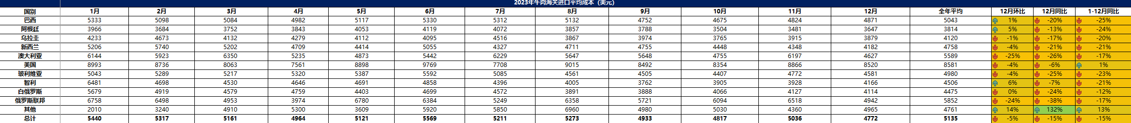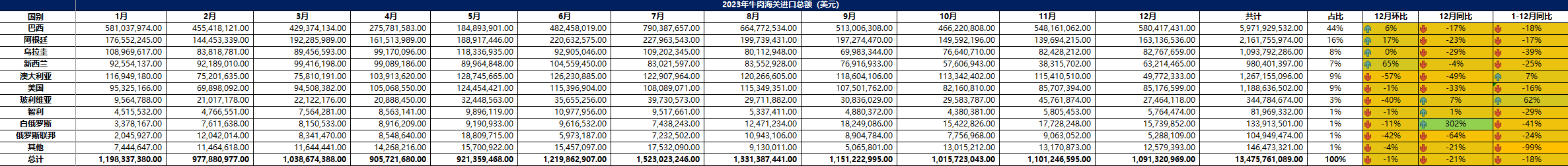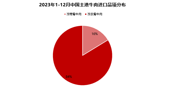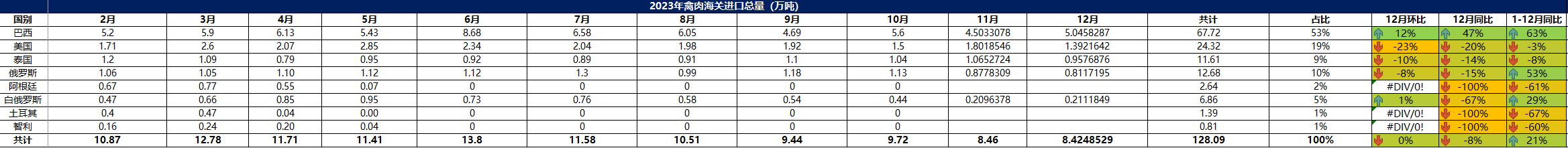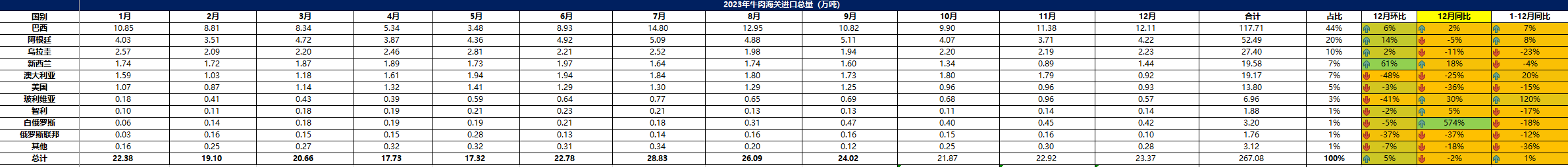 2023 年 12月中國主港牛肉進口量23.37萬噸,環(huán)比上升6%,同比上漲2%。1-12月, 中國主港牛肉進口總量 267.08萬噸,同比下降 2%。從進口國別看,進口巴西牛肉 117.7萬 噸,同比上漲7%,占比 44%。進口阿根廷牛肉52.49萬噸,同比增加 8%,占比 20%。 進口烏拉圭牛肉27.4萬噸,同比減少23%,占比 10%。進口新西蘭牛肉 19.58萬噸,同比下降4%,占比 7%。進口澳大利亞牛肉 19.17萬噸,同比增加 20%,占比 7%。從進口品項看,凍去骨牛肉進口總量223.55萬噸,占比 84%。凍帶骨牛肉進口總量 43.51萬噸,占比 16%。從進口金額看,1-12月,中國主港牛肉進口金額共計 1347.5億美金,同比減少 18%。 其中,巴西牛肉進口金額597.2億美金,同比下降18%。阿根廷牛肉進口金額216.17億美金, 同比減少 17%。澳大利亞牛肉進口金額126.7億美金,同比增加 7%。烏拉圭牛肉進口金額109.37 億美金,同比減少 39%。新西蘭牛肉進口金額98億美金,同比減少25%。