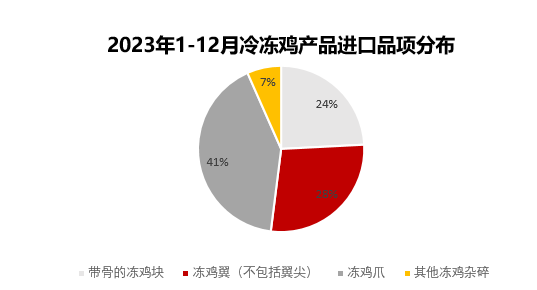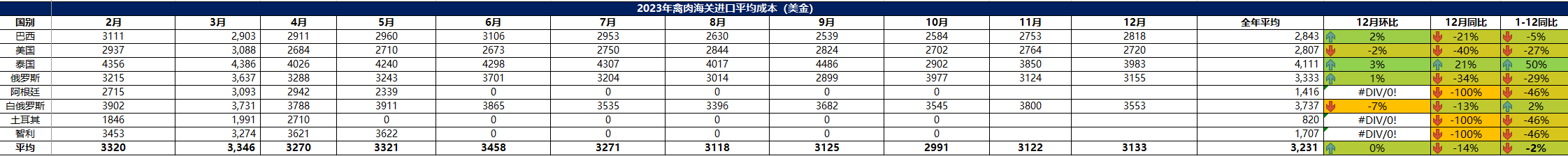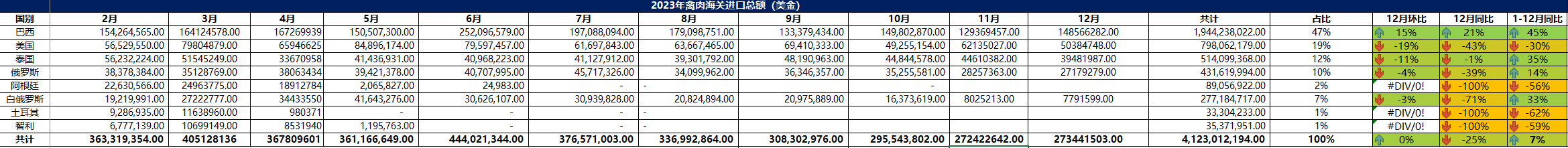 2023 年 12月中國主港禽肉進口量 8.42萬噸,環(huán)比下降13%,同比下降8%。1-12月,中國主港禽肉進口量128.09萬噸,同比增加 21%。從進口國別看,進口巴西禽肉共計 67.72萬噸,同比增加 63%,占比 53%。進口美國禽肉 4.32萬噸,同比減少 3%,占比 19%。進口俄羅斯禽肉 12.68萬噸,同比上漲53%,占比 10%。進口泰國禽肉11.61萬噸,同比增下降8%,占比 9%。從進口品項看,帶骨凍雞塊進口量30.99萬噸,占比 24%。凍雞翼(不包括翼尖)35.62 萬噸,占比 28%。凍雞爪進口量52.99萬噸,占比 41%。其他凍雞雜碎進口量 8.51萬噸,占比 7%。從進口金額看,1-12月,中國主港雞肉進口金額共計412.3億美金,同比增 加 7%。其中,巴西禽肉進口金額194.4億美金,同比增加45%。美國禽肉進口金額 79.8億美金,同比下滑 30%。泰國禽肉進口金額51.4億美元,同比增加 35%。俄羅斯禽肉進口金額 43.1億美金,同比增加14%。白俄羅斯禽肉進口金額 27.7 億美金,同比增33%。
