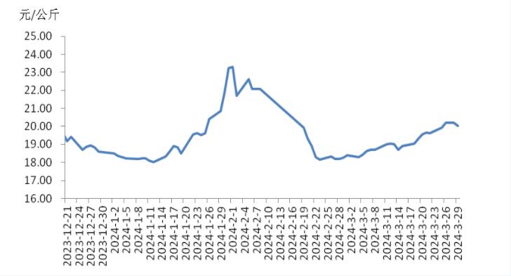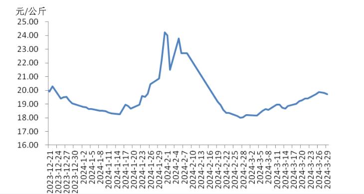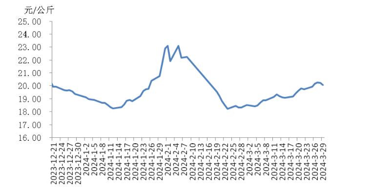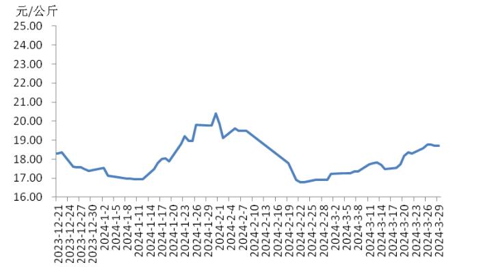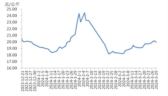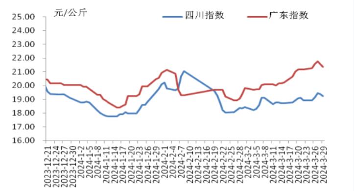 本周,四川豬肉周均價為每公斤19.24元,環(huán)比上漲1.5%,同比上漲5.9%,同比漲幅擴大3.7個百分點。周前期,川內(nèi)散養(yǎng)戶出欄生豬的節(jié)奏較穩(wěn)定,但豬源外調(diào)出川的數(shù)量增多,使得川內(nèi)生豬及豬肉供應偏緊,疊加豬肉經(jīng)銷商積極采購,推動豬肉價格上漲。周后期,消費市場對高價豬肉需求量減少,客戶訂單量減少,豬肉價格小幅回落??傮w看,本周四川地區(qū)豬肉周均價環(huán)比小幅上漲。