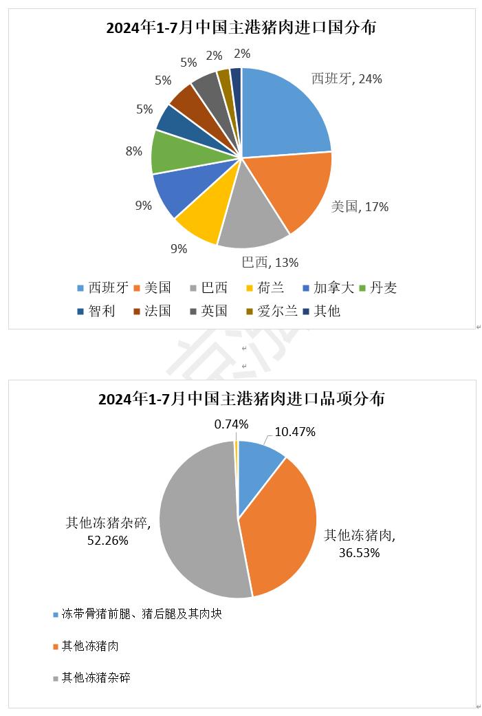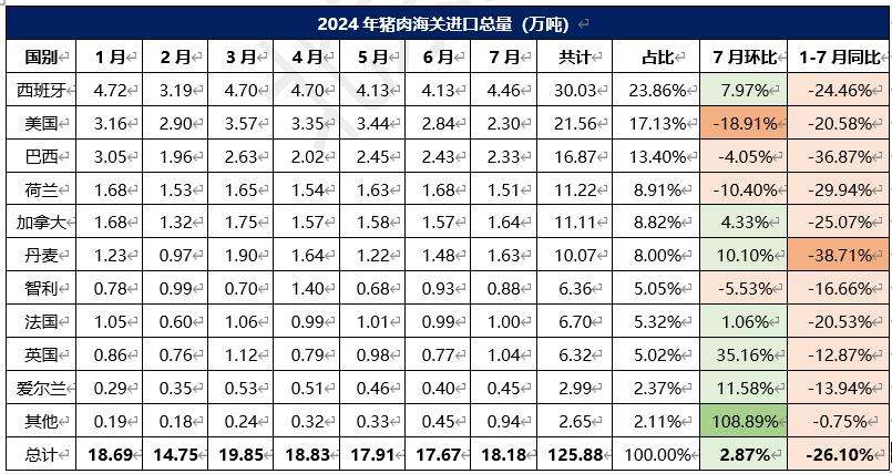 2024年1-7月中國主港豬肉進口量共計125.88萬噸,同比減少26%。進口金額25.70億美元,同比減少39%。