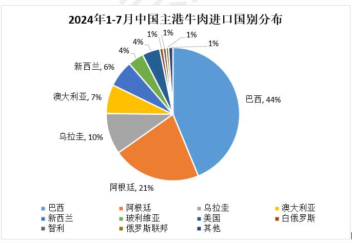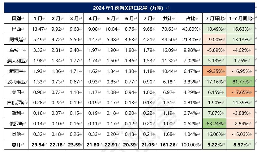從進口國別看,巴西、阿根廷、澳大利亞、玻利維亞、白俄羅斯等國進口總量同比增長,烏拉圭、新西蘭、美國、智利、俄羅斯等國進口總量同比下降。由于2023年1-2月玻利維亞無牛肉進口,因此玻利維亞進口同比漲幅高達82%。整體來看,2024年1-7月牛肉進口總量同比上升。