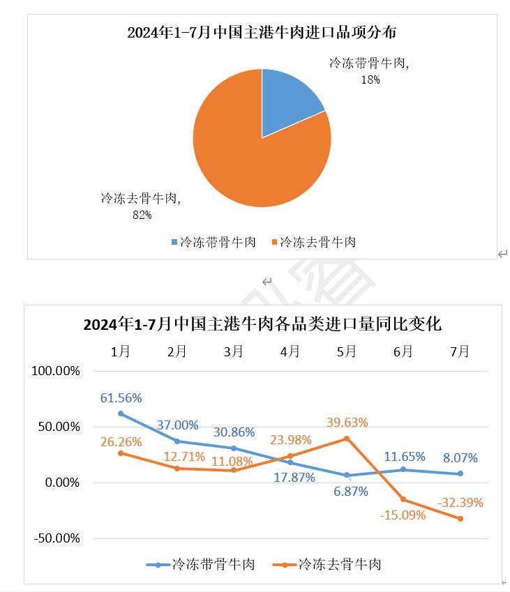 2024年1-7月中國主港牛肉進口量共計161.26萬噸,同比增長8.37%。1-7月中國主港牛肉進口金額共計74.46億美元,同比減少4.35%。