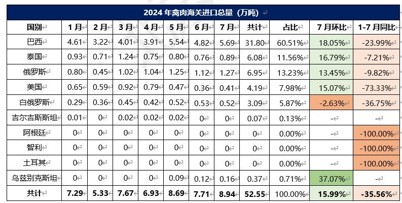 2024年1-7月中國主港進口禽肉數(shù)量共計52.55萬噸,同比減少35.56%,進口金額共計16.33億美元,同比減少38.04%。