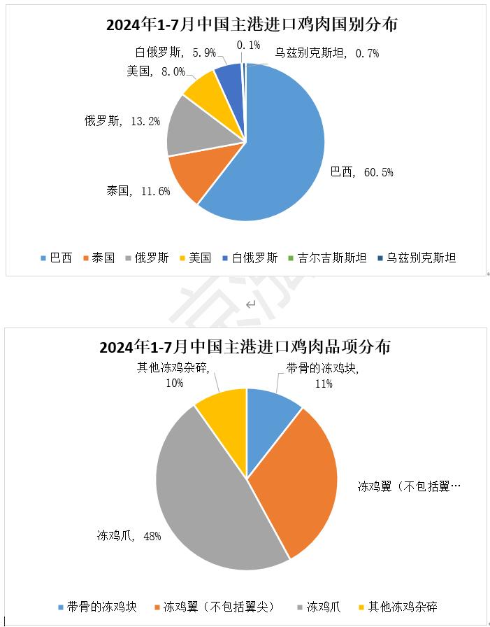 從進口品項看,冷凍雞爪共計進口25.32萬噸,冷凍雞翼(不包括翼尖)共計16.57萬噸,冷凍帶骨雞塊5.56萬噸,其他冷凍雞雜碎5.15萬噸。冷凍雞爪主要來自巴西、俄羅斯、美國和泰國,冷凍雞翼(不包括翼尖)主要來自巴西、泰國、俄羅斯和白俄羅斯,冷凍帶骨雞塊主要來自巴西和美國,其他冷凍雞雜碎主要來自巴西和泰國。