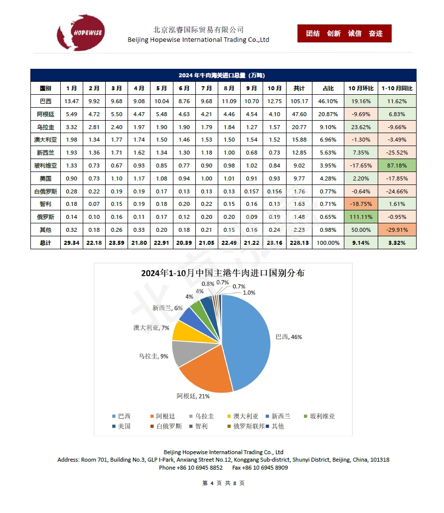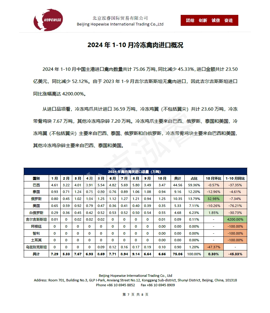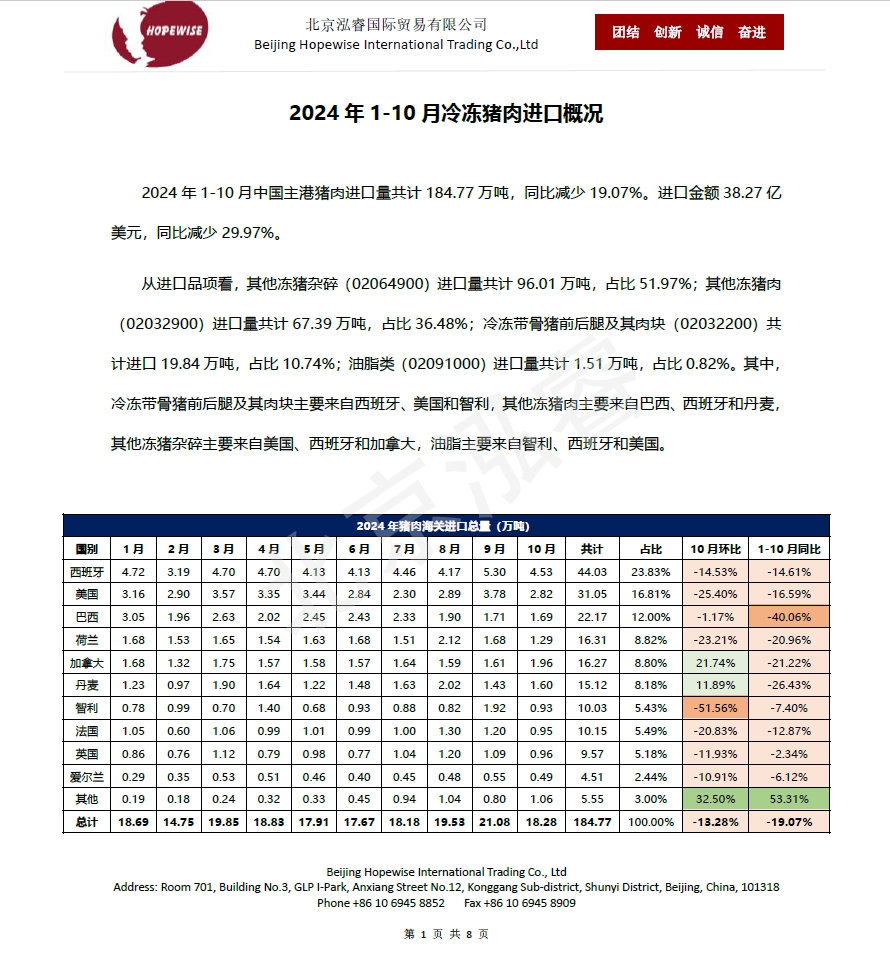 2024年1-10月冷凍豬牛禽肉海關(guān)進(jìn)口...